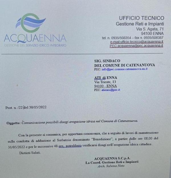 per le successive 48 ore potrebbero verificarsi disagi nell'erogazione idrica cittadina. Vedasi allegato avviso.