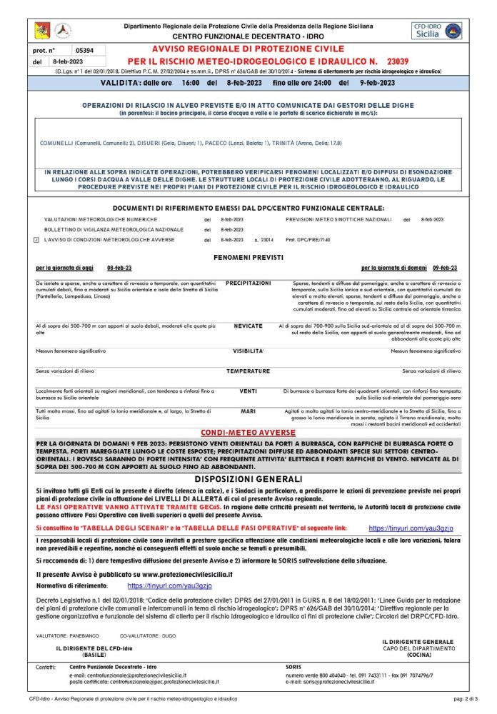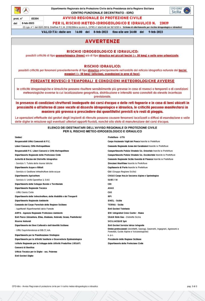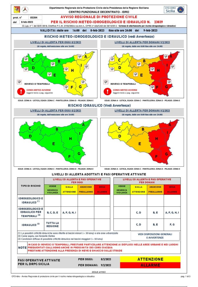 L'Allegato avviso di Allerta Meteo, diramato dal Dipartimento regionale della Protezione, viene pubblicato in questo sito su disposizione dell'Assessora Dott.ssa Roberta Rizzo