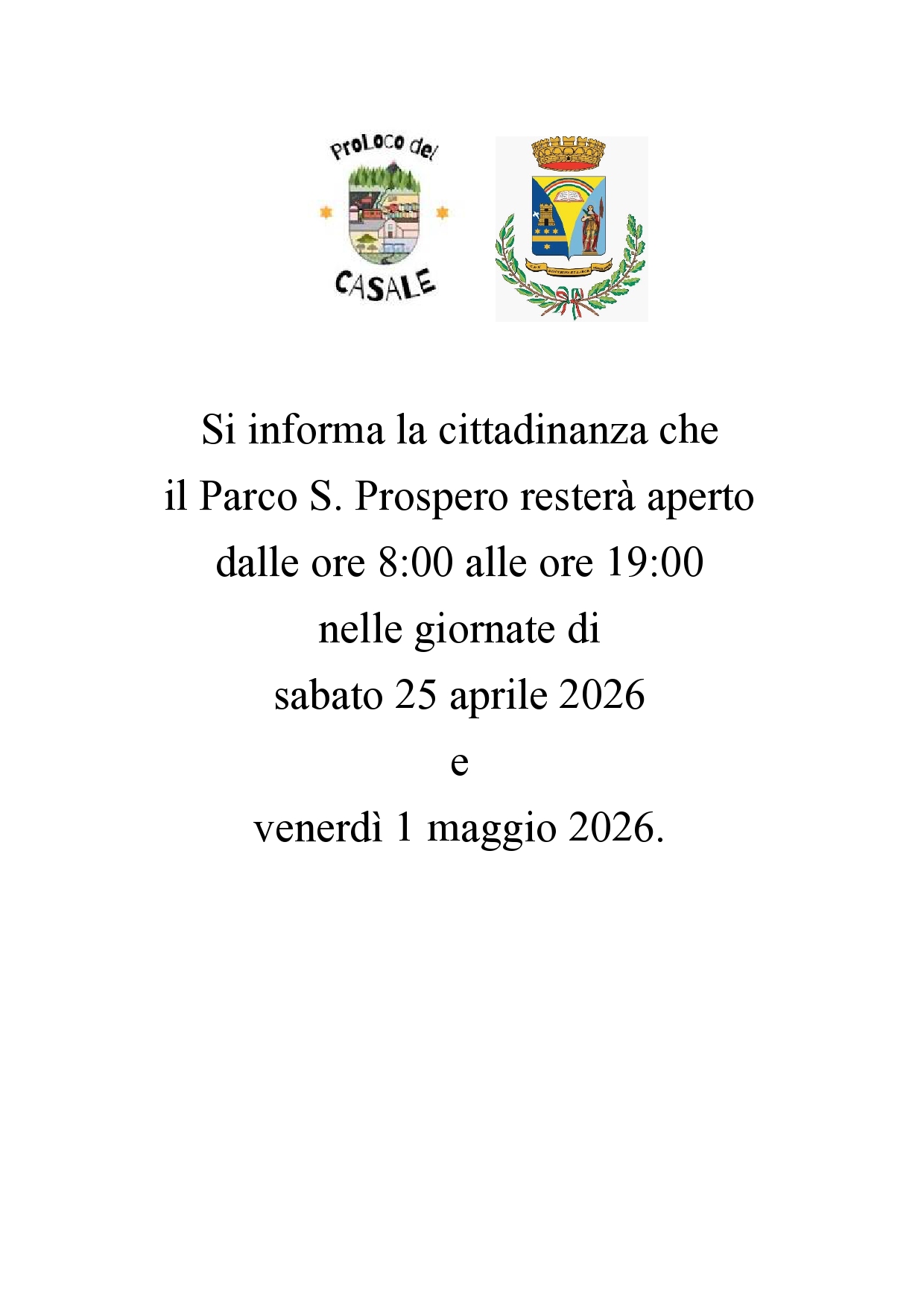 Si informa la cittadinanza che il Parco S. Prospero resterà aperto dalle ore 8:00 alle ore 19:00 nelle giornate di